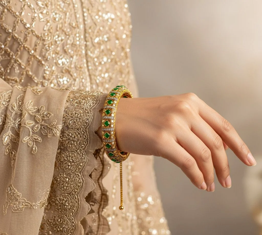 Your choice of vivid green or traditional white stones are expertly positioned to catch the light with each movement, adorning the bangle in a stunning way.