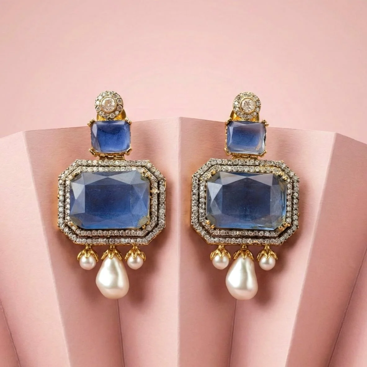 The earrings have a gold-plated frame and are set with azure blue stones in the middle, accentuated by white stones.