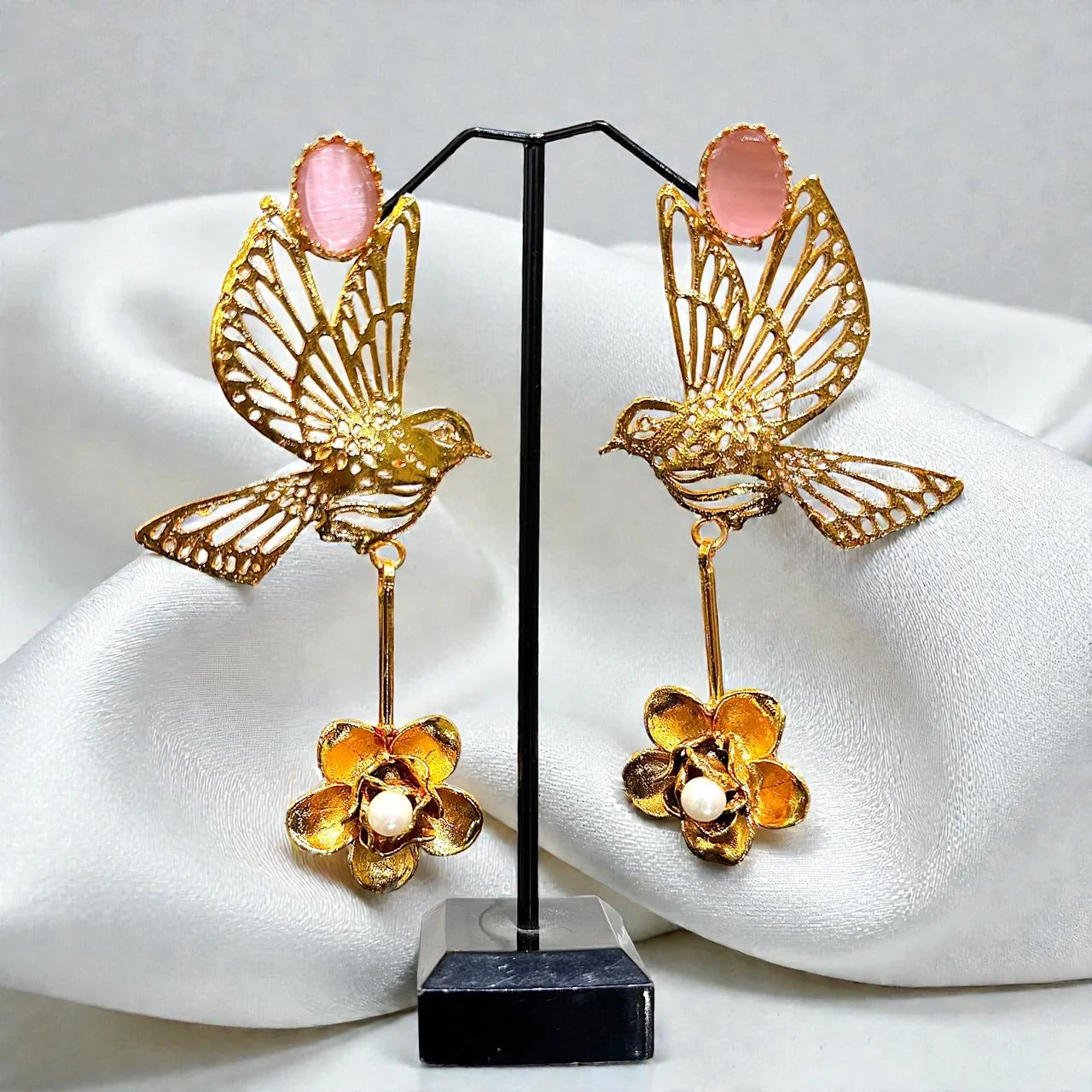 Each earring has a polished golden frame with a wonderfully sculpted sparrow motif that represents freedom and elegance.