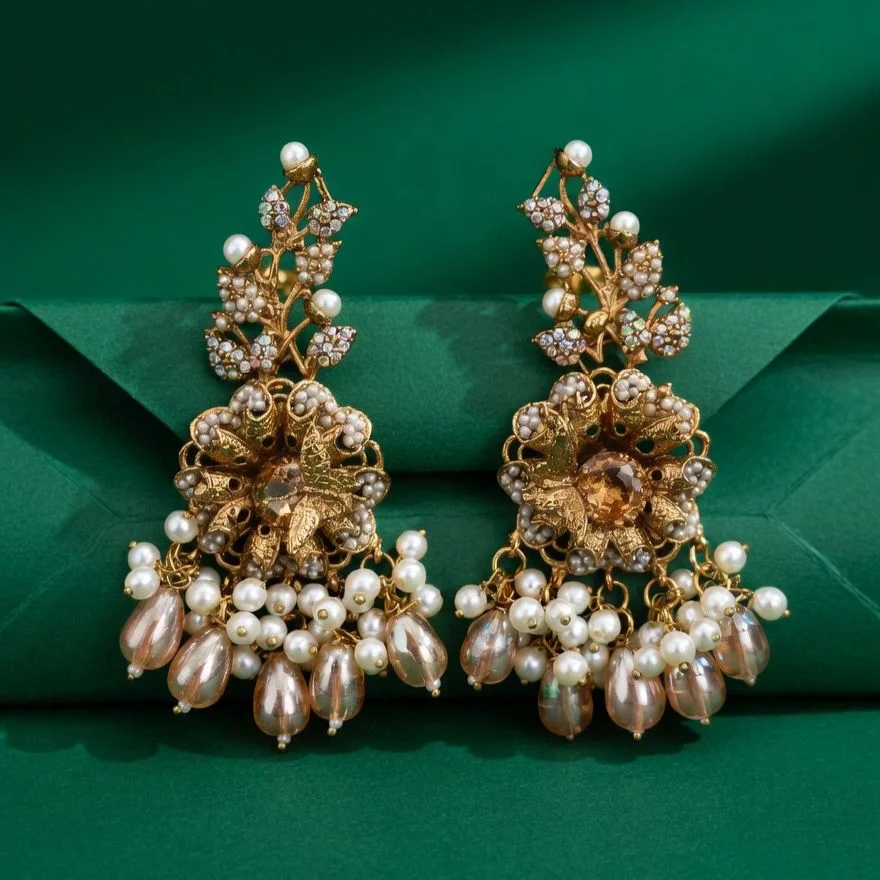 These earrings, enhanced with delicate glittering gems and exquisite white pearl drops, provide the ideal harmony of sparkle and tenderness.