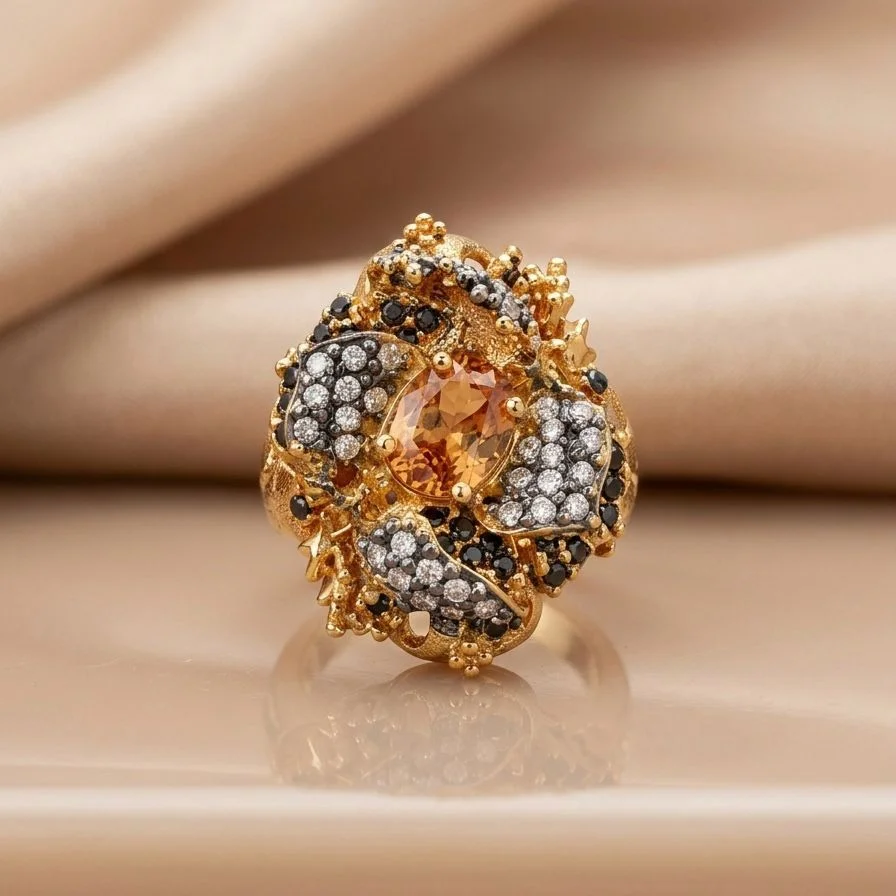Featuring a luminous champagne stone at its center, this ring is beautifully enhanced with bold black gems and sparkling silver zircon accents, creating a striking contrast.