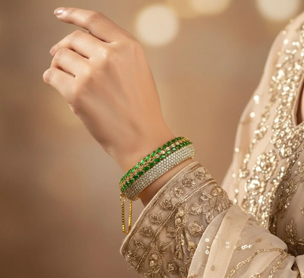 Glistening green and silver stones embellish the bangle, forming a striking contrast that catches the light from all directions.