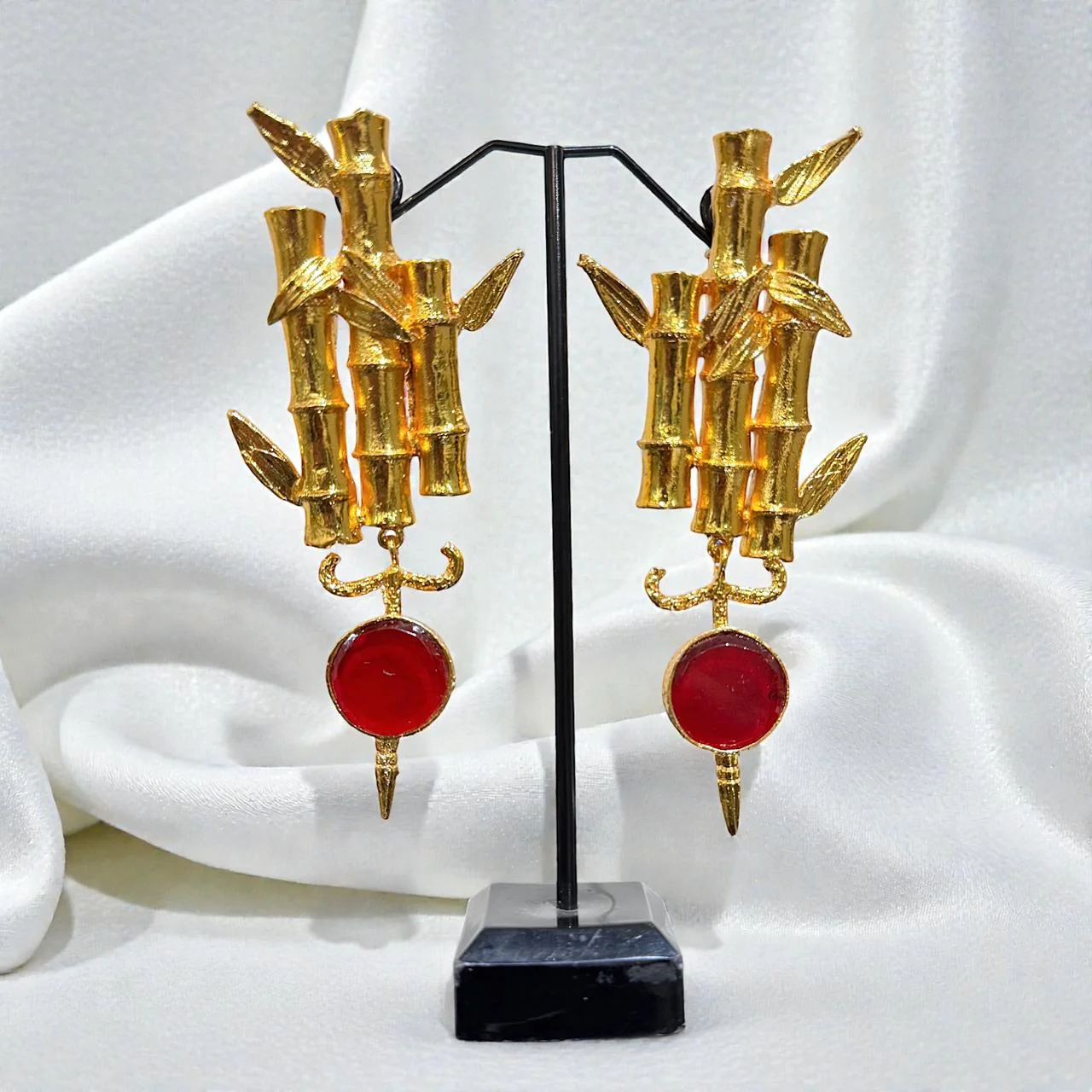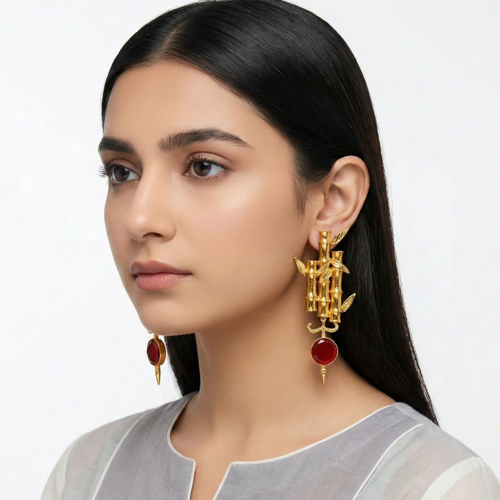 With a bright red stone in the center and a rich golden frame, these exquisitely created Classy Red Stone Earrings will elevate your appearance.