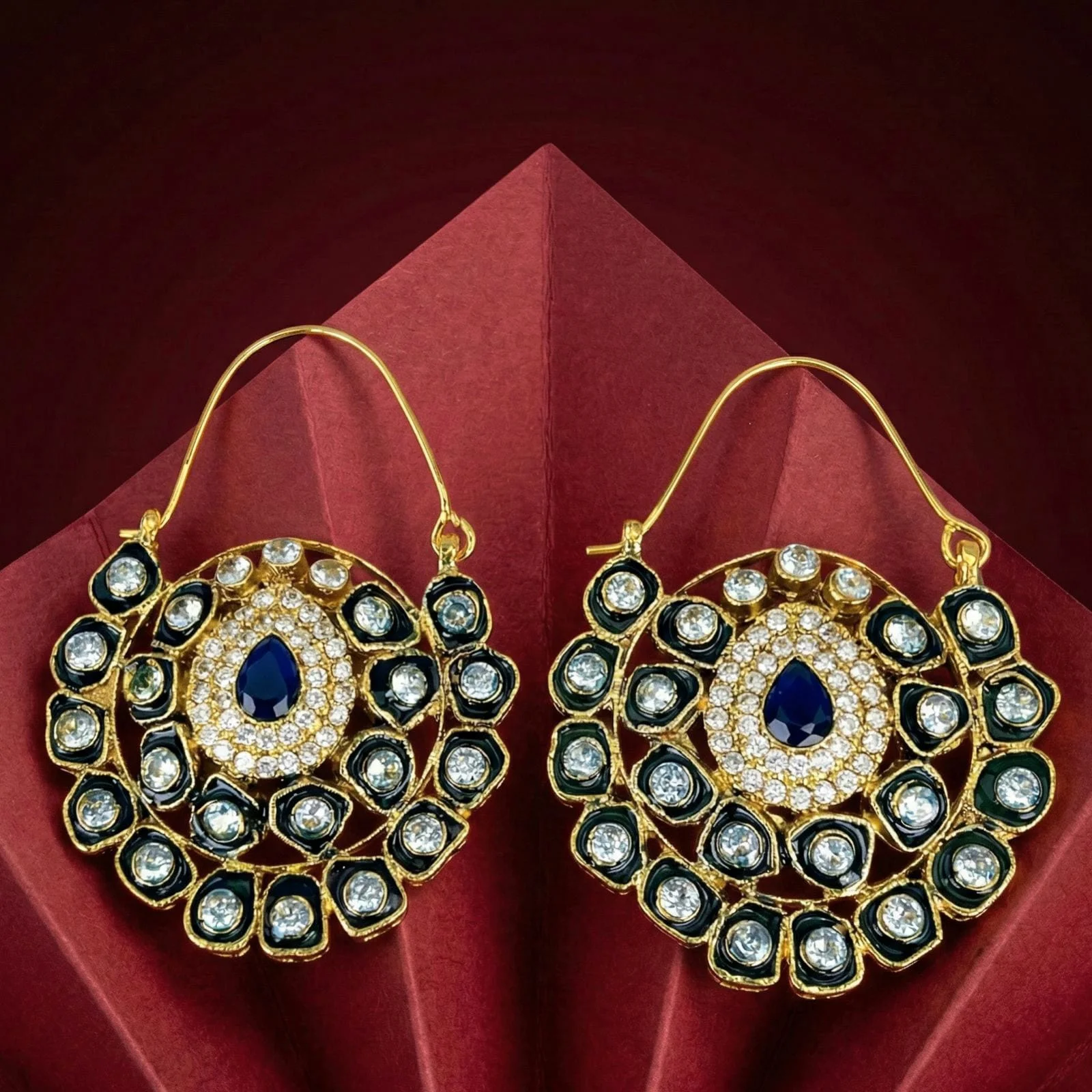 These earrings, which have a stunning blue drop-shaped stone in the middle, epitomize style and vivid color.