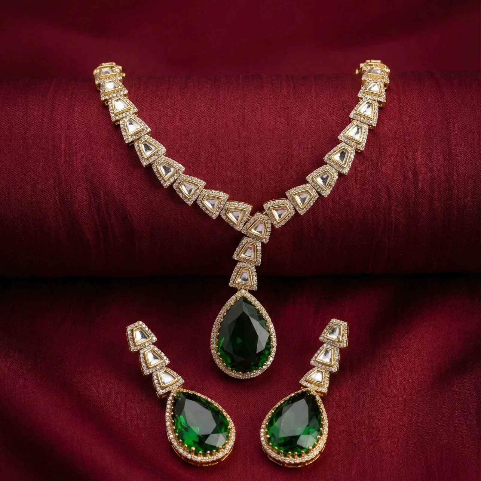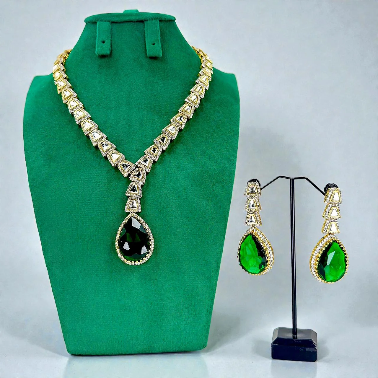 A bold yet elegant focal point is created by the centerpiece’s eye-catching drop-shaped green stone, which is elegantly positioned in the center.