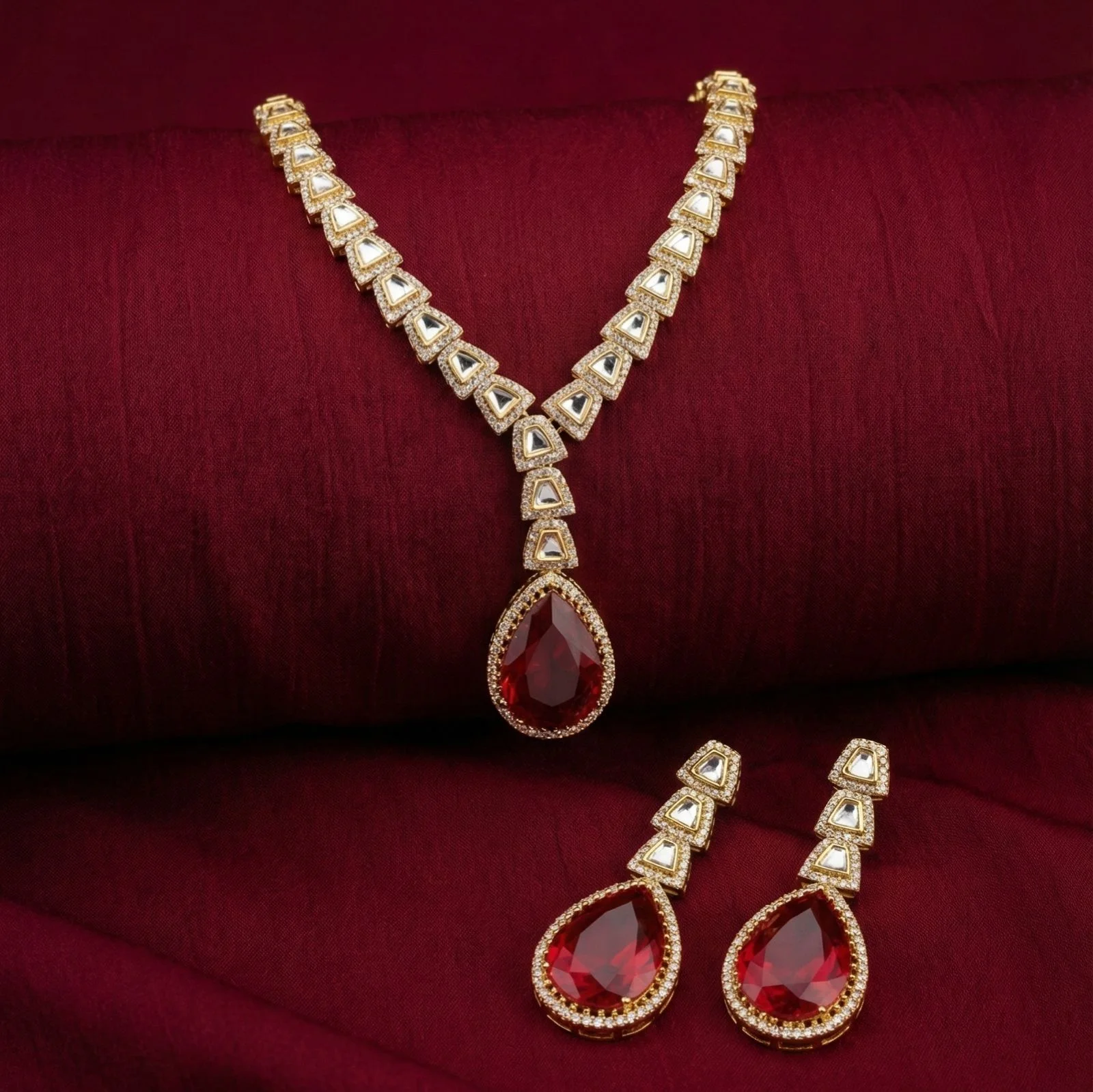 A dramatic allure and a hint of royal charm are added by the brilliant red drop stone at the center of the set.