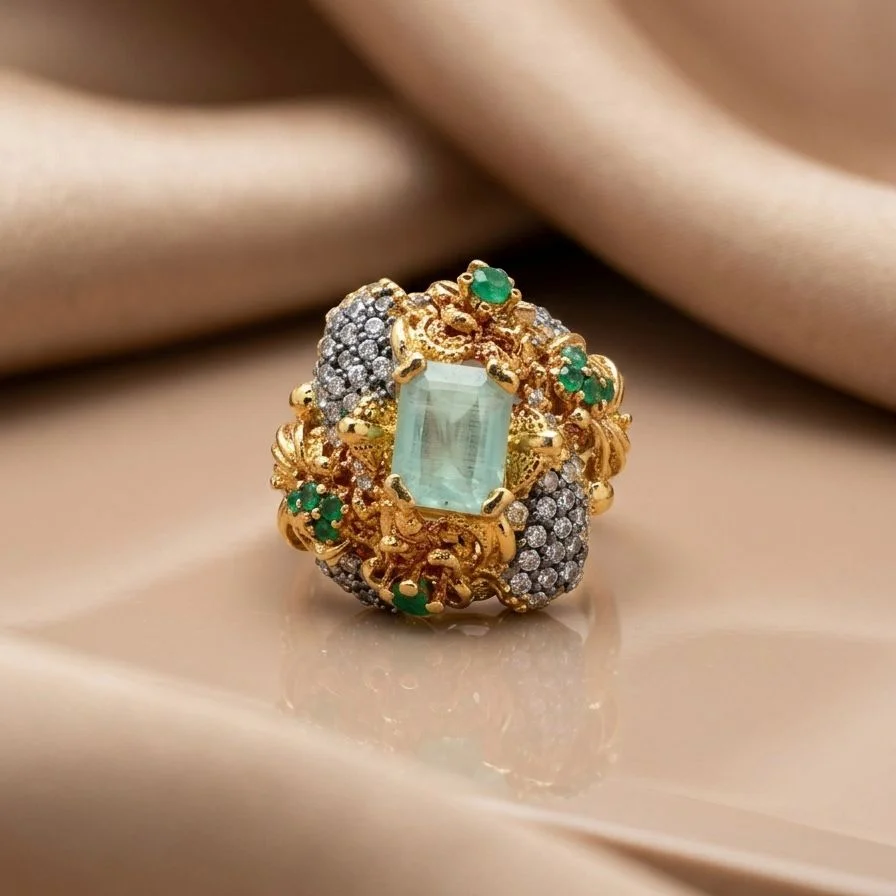 This ring is a striking addition to your jewelry collection since it combines vibrant color with timeless charm, making it ideal for adding a distinctive and opulent touch to any ensemble.