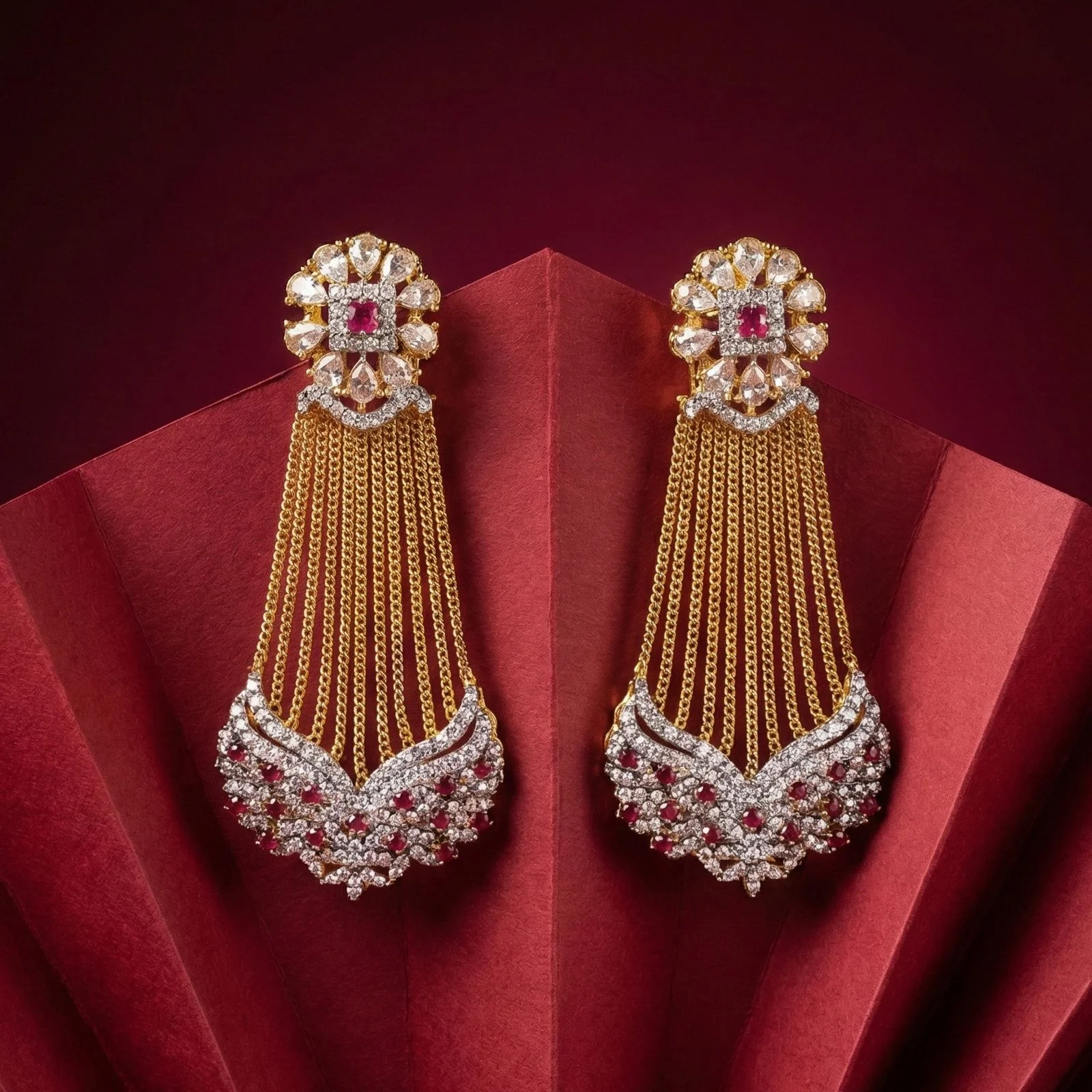 The earrings have a silver zircon pattern or a delicate floral design on top, accentuated with maroon jewels for a rich, opulent finish.