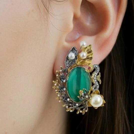 These earrings radiate classic charm and elegance with their rich jade-green stones nested in a lovely golden foliage design.