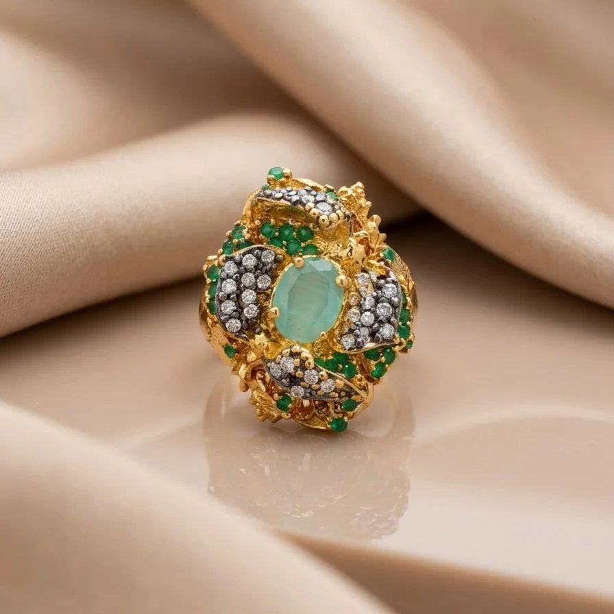This ring, which has a small pistachio stone in the middle and a sleek gold-plated band, exudes a subtle and elegant appeal.