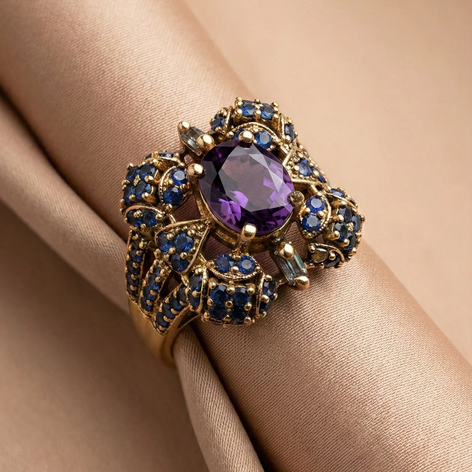 This gorgeous Queens Radiance Ring in size 08 has a vivid purple center stone that is exquisitely complemented by glittering blue gems that provide sparkle and depth.