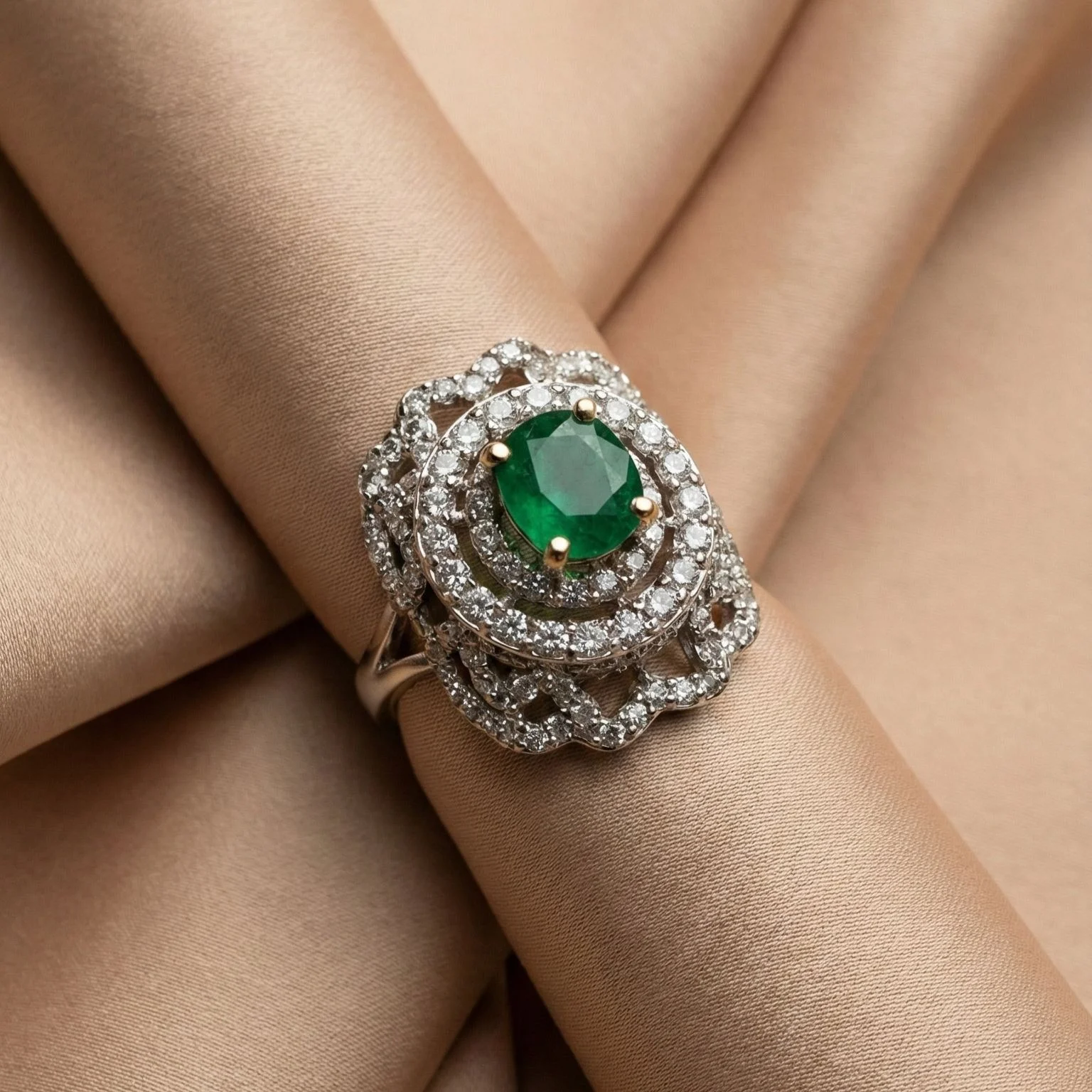 This magnificent Royal Heritage Ring in size 08 has a brilliant royal green center stone that is tastefully placed inside a crown-inspired design that is embellished with shimmering silver zircon stones.