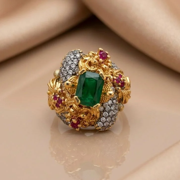 The pattern is further enhanced by delicate silver zircon accents and shimmering green stones, which lend sparkle and an opulent finish.