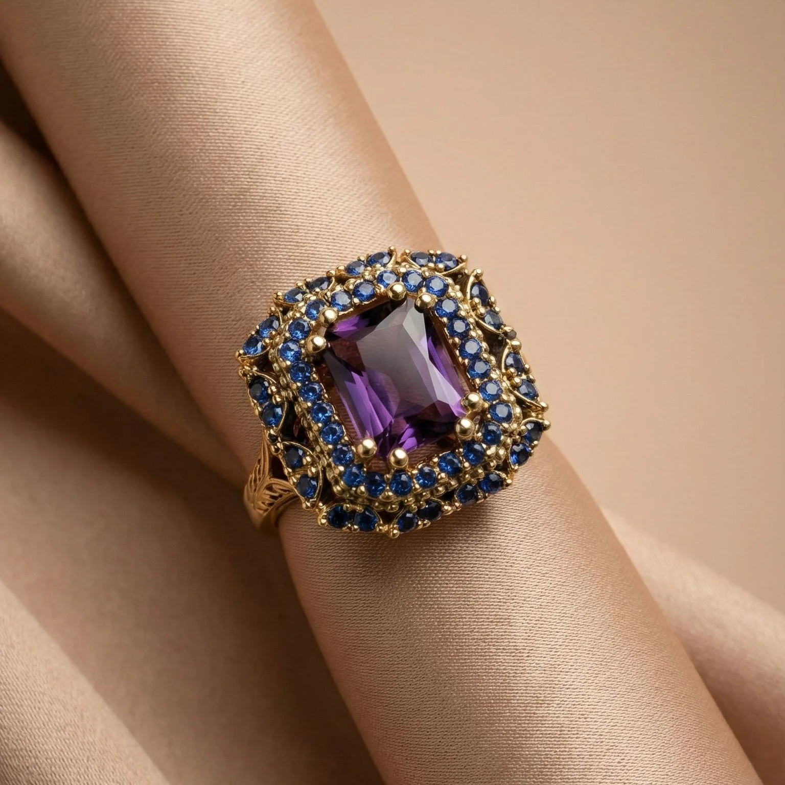 This gorgeous ring has a dazzling purple stone set in the center of a gold-plated band, creating an opulent and striking focal point.