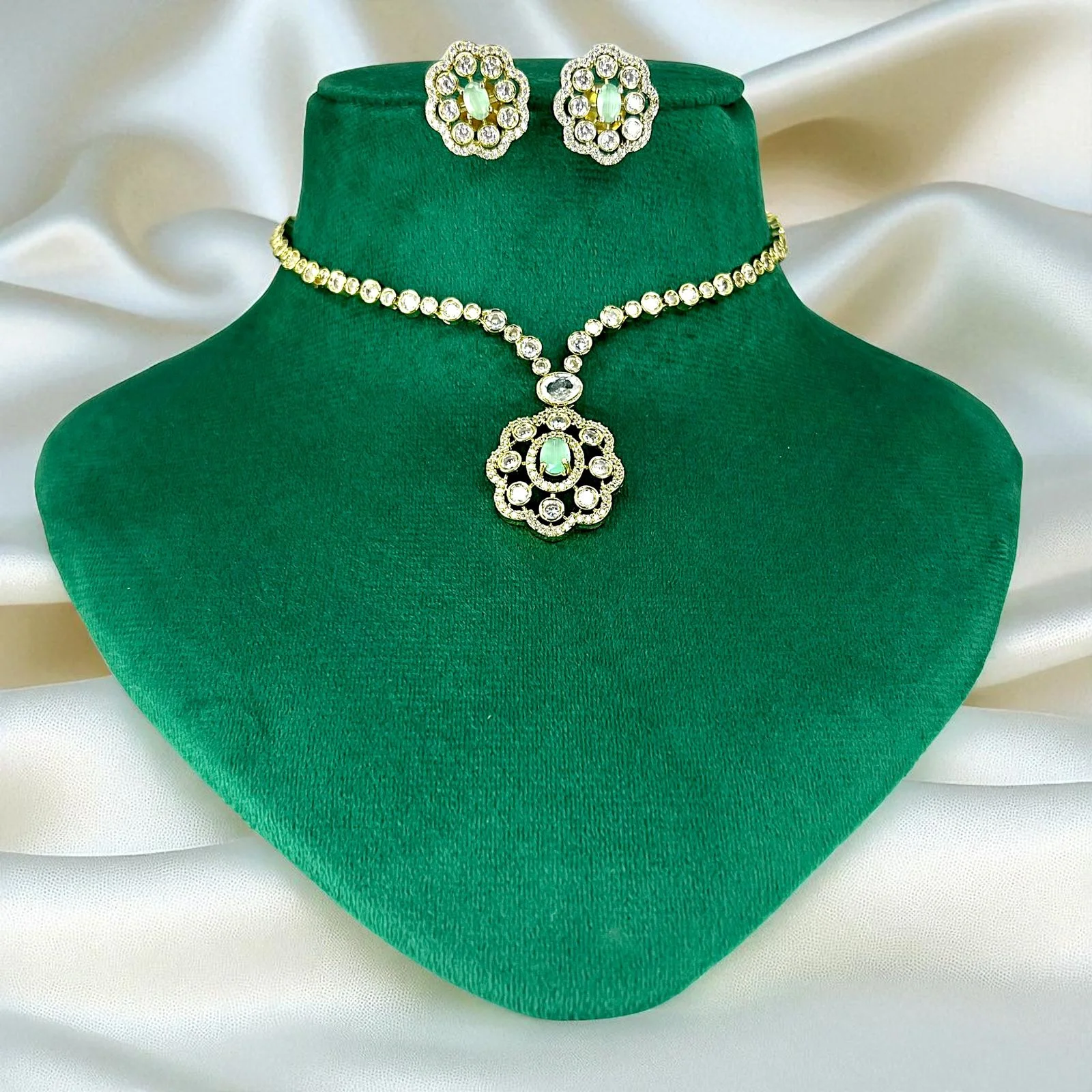 This gorgeous turquoise necklace set, which reflects the delicate beauty of South Indian jewelry, captures the spirit of regal tradition.